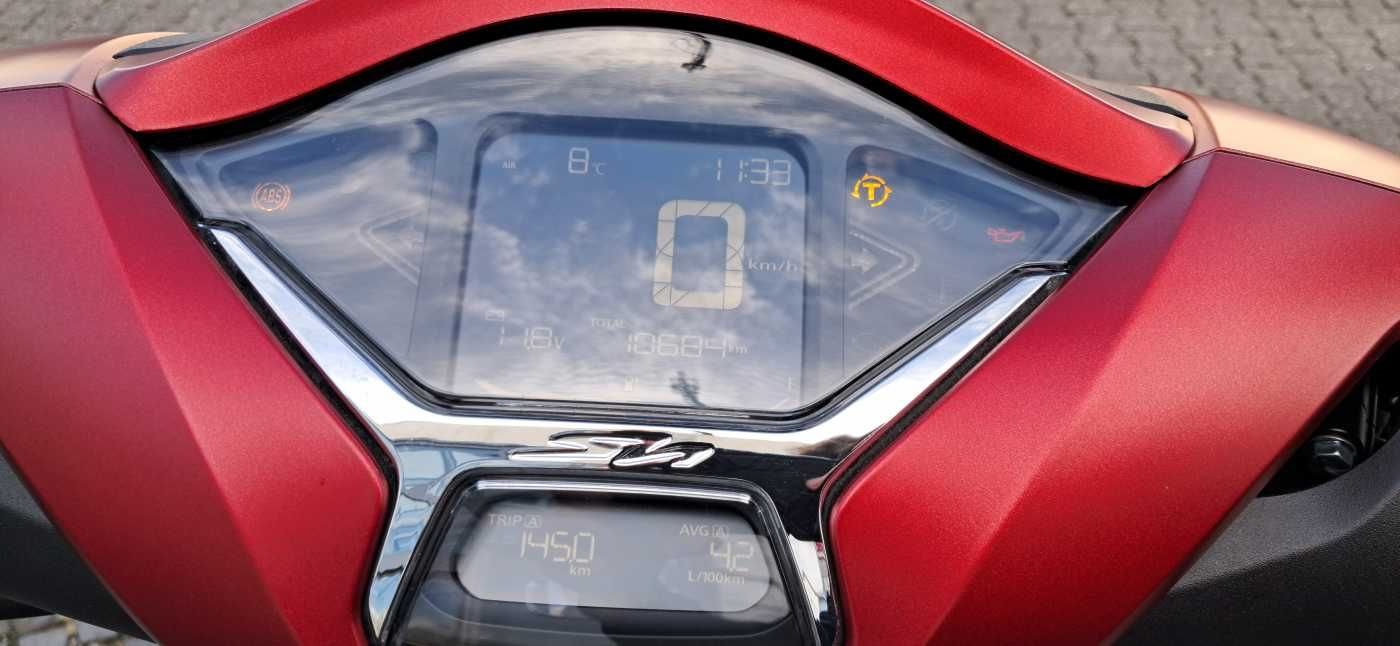 Der neue SH350i unterscheidet sich, abgesehen von den etwas grimmiger dreinblickenden LED-Scheinwerfern, vorrangig durch den neuen, 50 Kubik größeren Motor. Damit flitzt der SH350i noch agiler davon, als es der ohnehin erstaunlich flinke SH300i schon getan hat. Das Fahrverhalten ist so stabil, wie man es von den großen Rädern erwarten darf, trotzdem angenehm handlich und vor allem sehr komfortabel. Das praktische Smart Key-System bleibt erhalten, neu sind die Traktionskontrolle HSTC als „Sicherheitsnetz“ und die Voll-LCD-Armaturen, die den 350er-SH zur schlauen Evolution des SH300i machen.